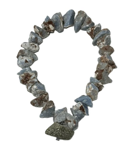 Infuse your space with serenity and strength with this exquisite Angelite Blue Quartz Necklace, featuring a captivating pyrite centerpiece. The cool, calming tones of angelite blue quartz are believed to promote tranquility, communication, and heightened awareness, making it an ideal stone for those seeking peace and clarity. The striking pyrite center adds a touch of grounding energy, symbolizing protection and prosperity.