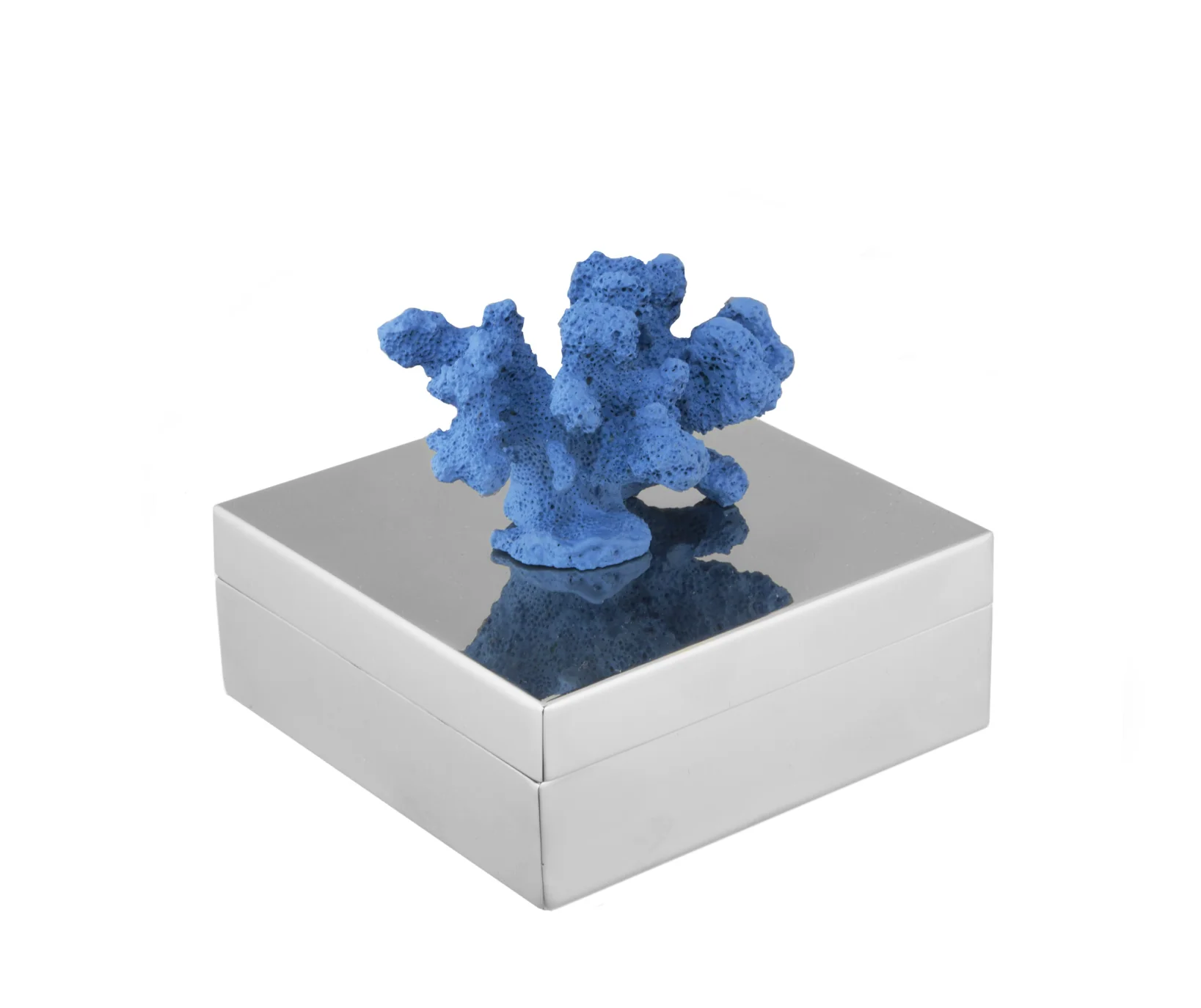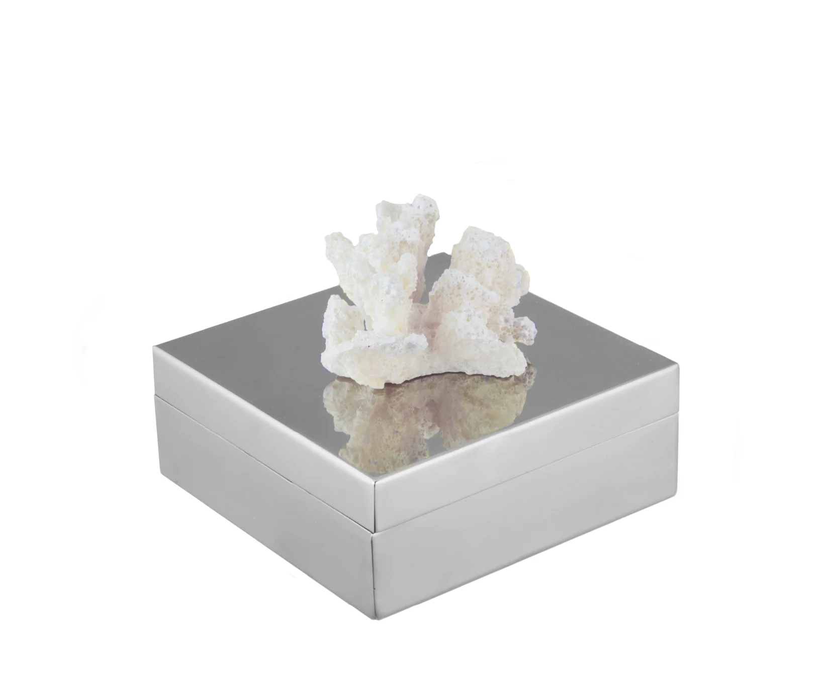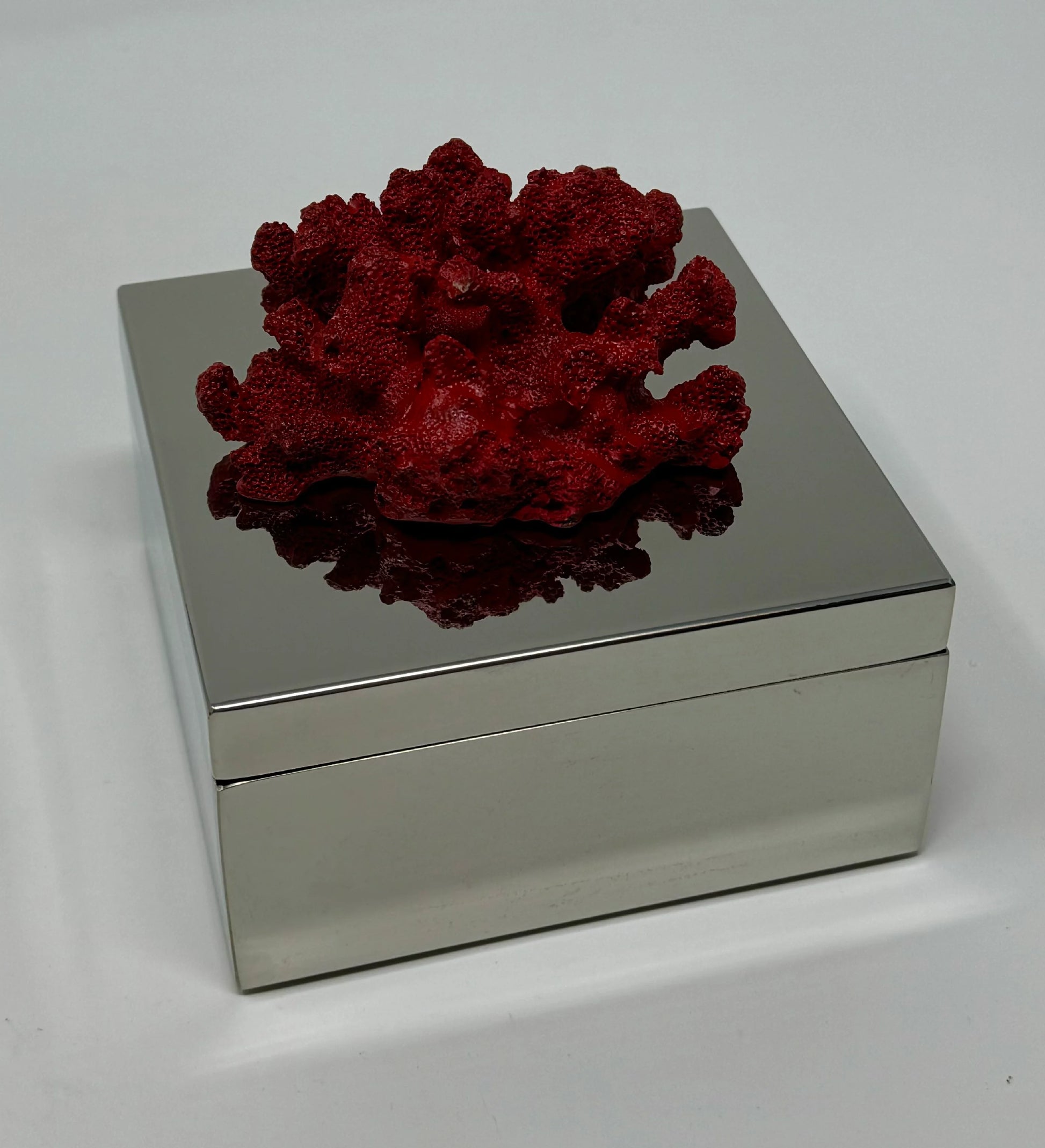 The combination of the natural, organic form of the coral with the geometric, metallic box creates an interesting juxtaposition of textures and styles, blending natural and modern design elements. Perfect for home décor or jewelry box